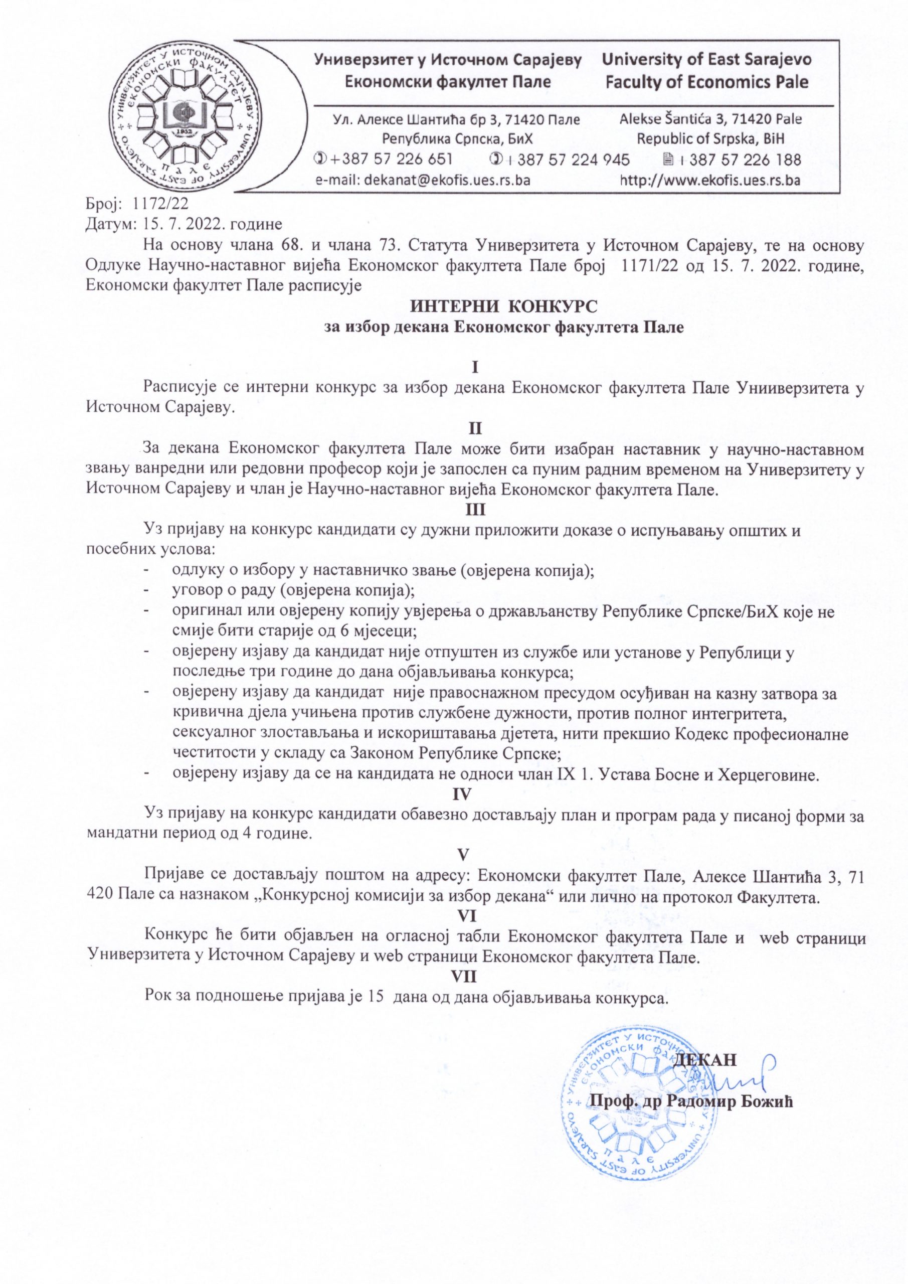 Интерни конкурс за избор декана