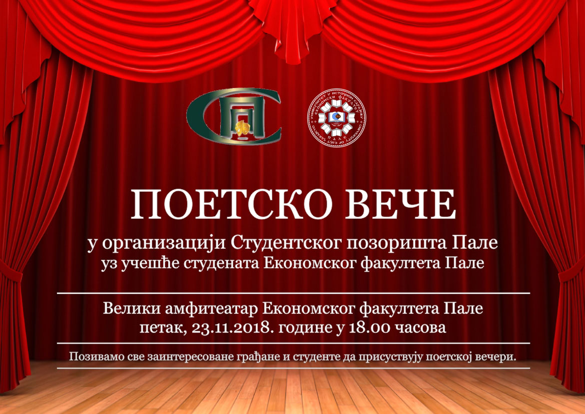 U petak, 23. novembra 2018. godine u 18.00 časova u velikom amfiteatru Ekonomskog fakulteta Pale održaće se poetsko veče u organizaciji Studentskog pozorišta Pale uz učešće studenata Ekonomskog fakulteta Pale. Poetsko veče se organizuje povodom obilježavanja Dana fakulteta odnosno proslave 66 godina tradicije i 25 godina rada u Srpskoj. Pozivamo sve zainterosavane nastavnike, saradnike, studente i građane da prisustvuju poetskoj večeri.