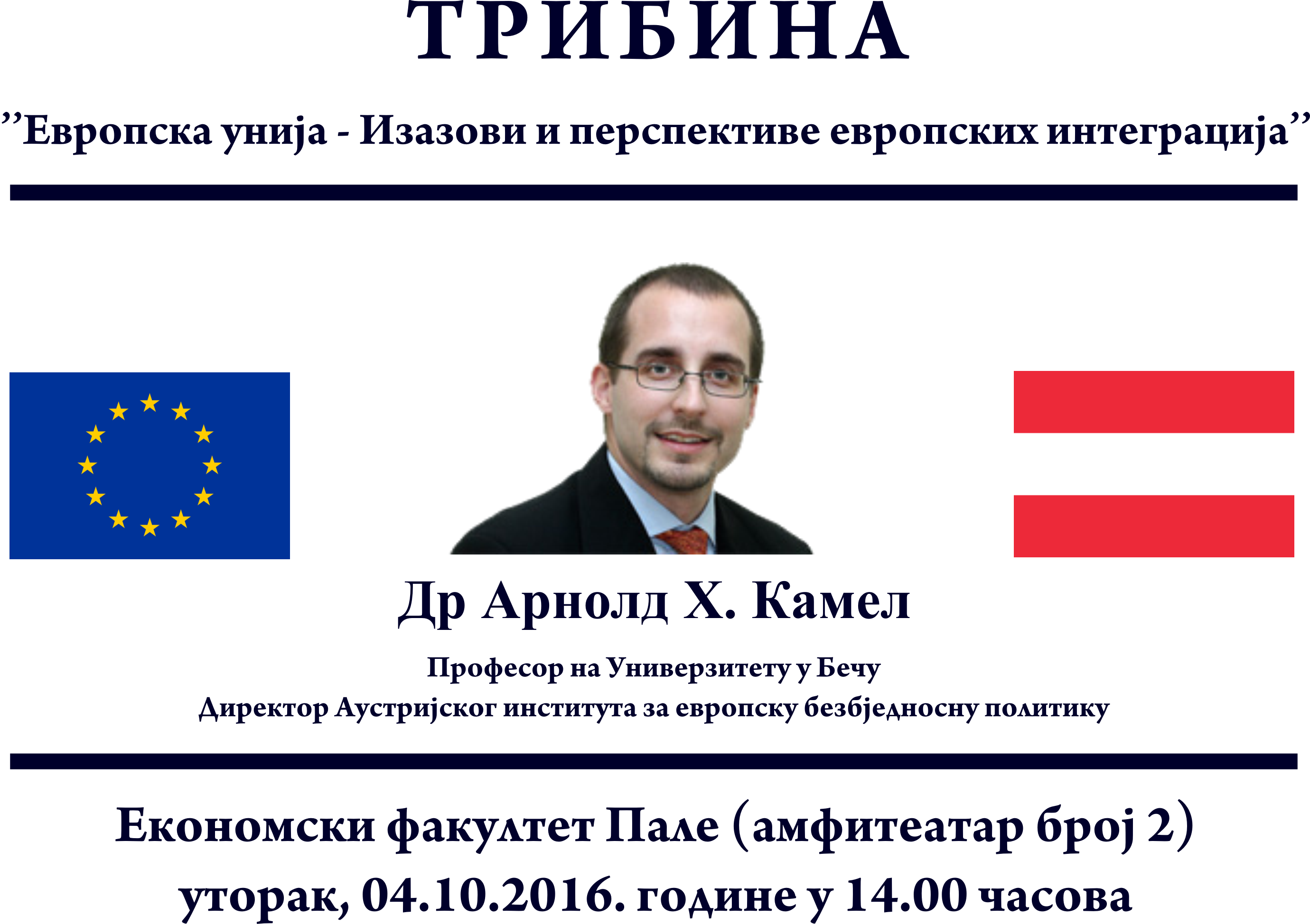 Na Ekonomskom fakultetu Pale u utorak 04.10.2016.godine sa početkom u 14.00 časova (amfitetatar broj 2) održaće se tribina na temu “Evropska unija – Izazovi i perspektive evropskih integracija“. Govornik će biti dr Arnold H. Kammel, profesor na Univerzitetu u Beču i direktor Austrijskog instituta za evropsku bezbjednosnu politiku.